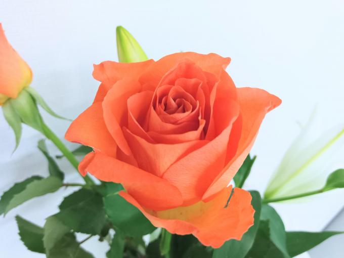 明るいオレンジのバラとホワイトのユリを選びました。