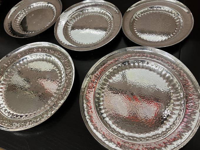 銀製食器のお買取です。こちらは名入れがしてある飾皿となります。全て純銀製。結構な重さがございます。ここのところ銀の買取価格も非常に上がってきており、ゴールド、プラチナと比べ実はシルバーの上昇率がトップです。以前とは考えられないようなお値段が付く場合もございますので、ぜひおまかせください。おかげさまで14周年!金・銀・プラチナのお買取りもおたからや箕面店へ!