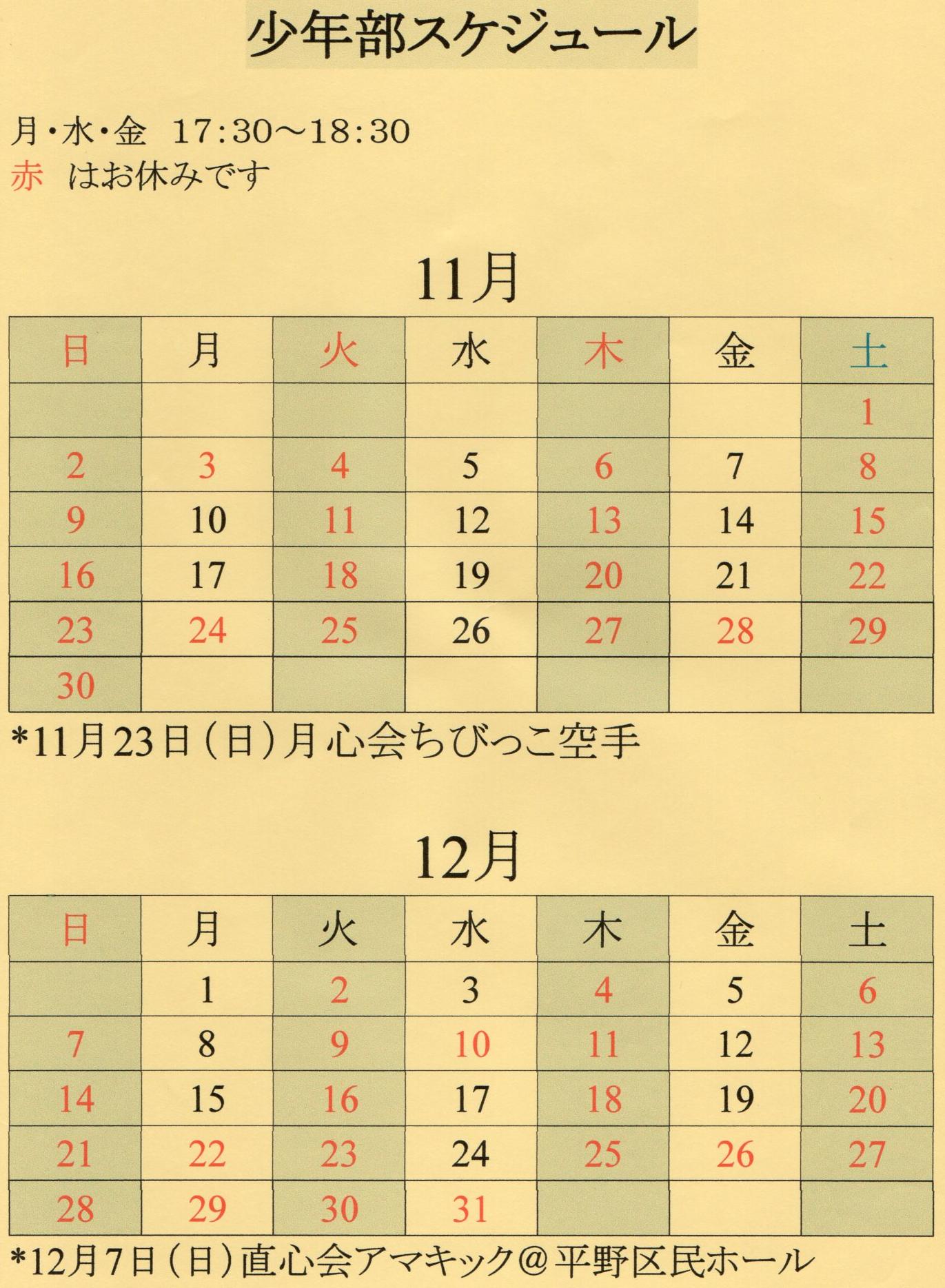 少年グローブ空手教室スケジュール(11月12月)【新規生徒募集!】キックボクシング直心会