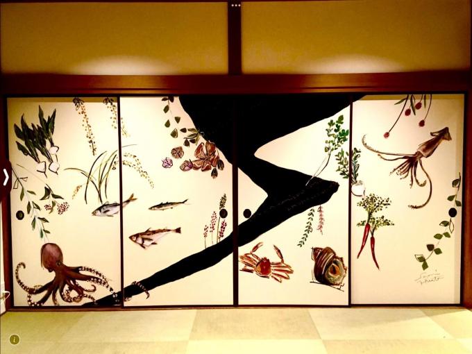 お店のドア・窓・襖(ふすま)・外壁・駅舎などにも描いています。
