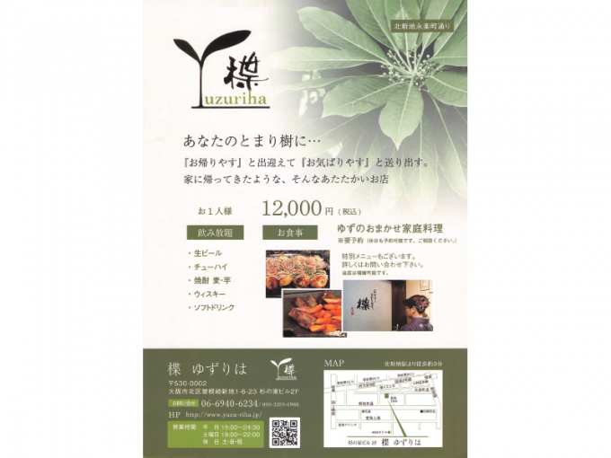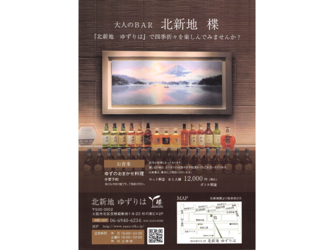 JR東西線北新地駅より徒歩2分 大阪メトロ御堂筋線梅田駅より徒歩5分 |